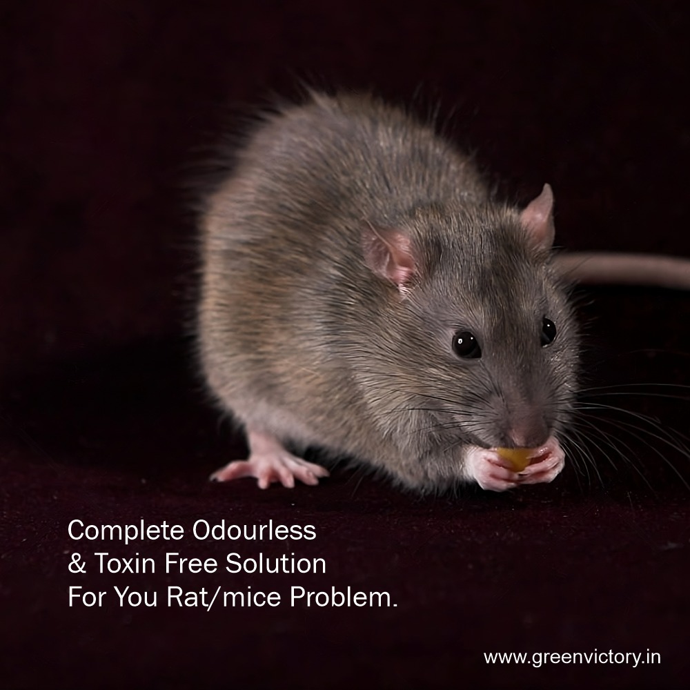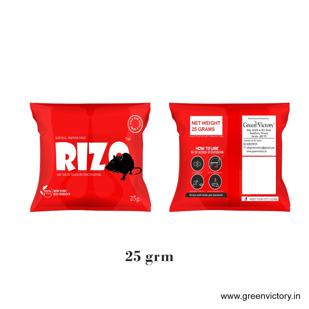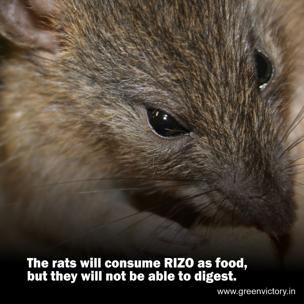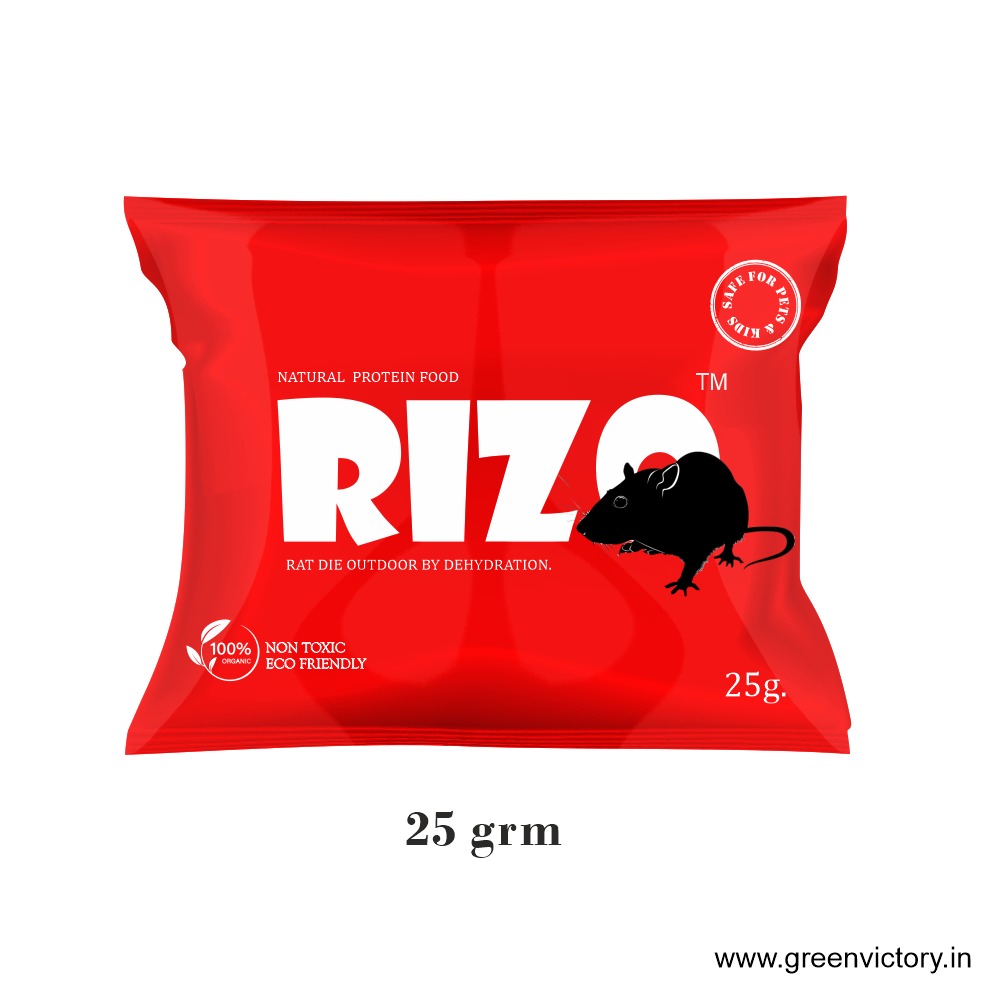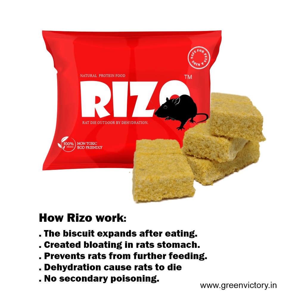 Rats in the home can do a lot of damage, contaminate food, and transmit disease.1 Unfortunately, you may not know you have a rat problem until it's out of control. It can also be difficult to permanently prevent rat entry unless you close all cracks, holes, and gaps around your home. Traps other methods are widely applied but the control or prevention is not fully possible as the use of chemicals or pesticide are strictly dangerous to us.We GreenVictory® introduce you RIZOTM. This is a protein based biscuit, used for the controlling elimination rats & mic in most affordable economic way. RIZOTm is safe to use around kids & pets as they are natural & eco-friendly.