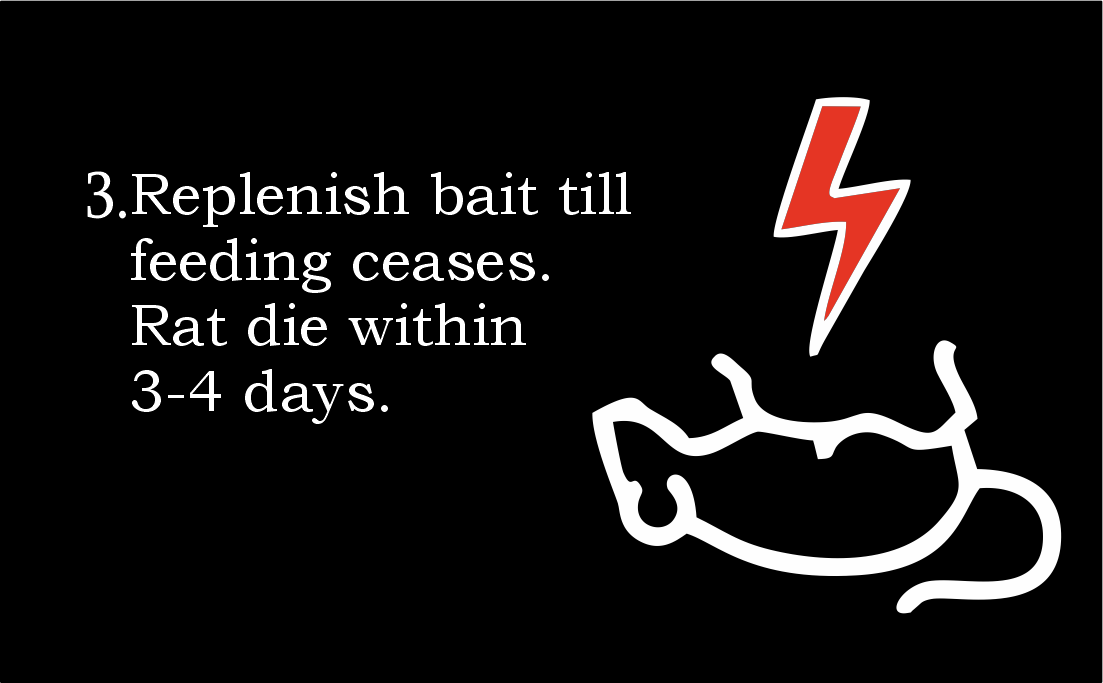 3. REPLENISH BAIT TILL FEEDING CEASES. RAT DIE WITHIN 3-4 DAYS.